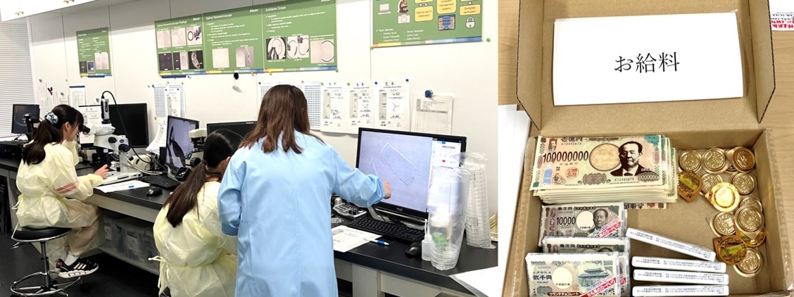 品質保証本部の仕事の体験としては、実体顕微鏡でコンタクトレンズを観察し、品質を確認するお仕事体験コーナーが設けられ、実際にあった事例も踏まえながら、報告書の作成を体験しました(写真左)。体験の終了後には、お給料に見立てた、お菓子のお土産も配布されました(写真右)。