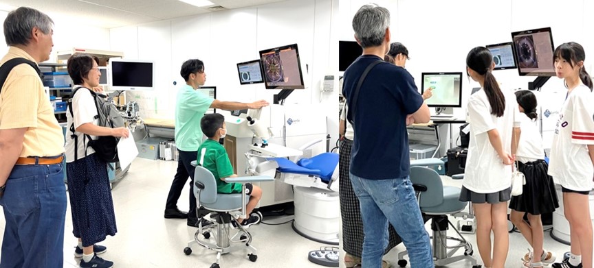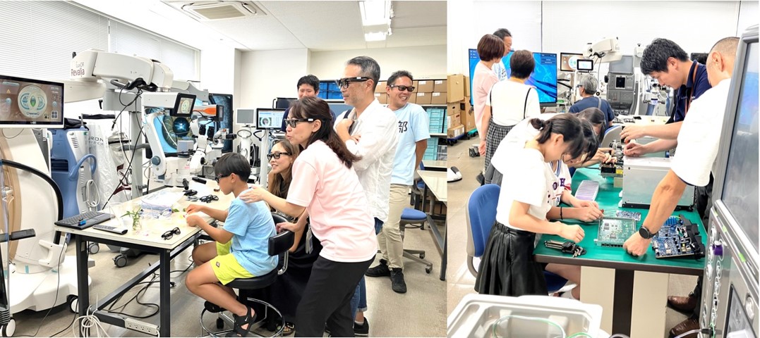 技術部の仕事体験としては、本物のレーザーによる手術器機の操作体験も行われました(写真左)。どのようにレーザーが患部に届くのか、また器機の裏側の仕組みなど、技術部のプロフェッショナルによる解説に沢山の質問が飛び交いました(写真右)。