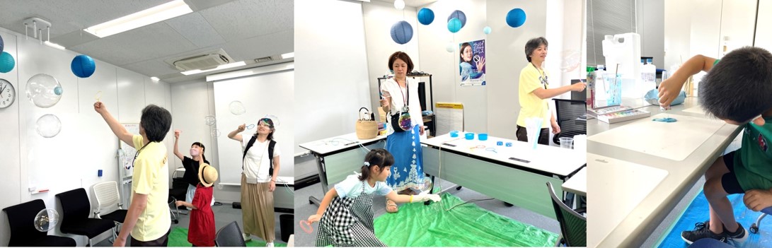 シャボン玉、スライム、そしてアルコンの一日使い捨てコンタクトレンズ原料に使用されているPVA(ポリビニルアルコール)を添加して粘稠度を増加させたシャボン玉づくりを通じて、PVAの機能を学びます。PVAを追加することで触っても簡単には割れないシャボン玉が完成し、特に小さなお子さんたちには大好評でした。(写真左・中央)