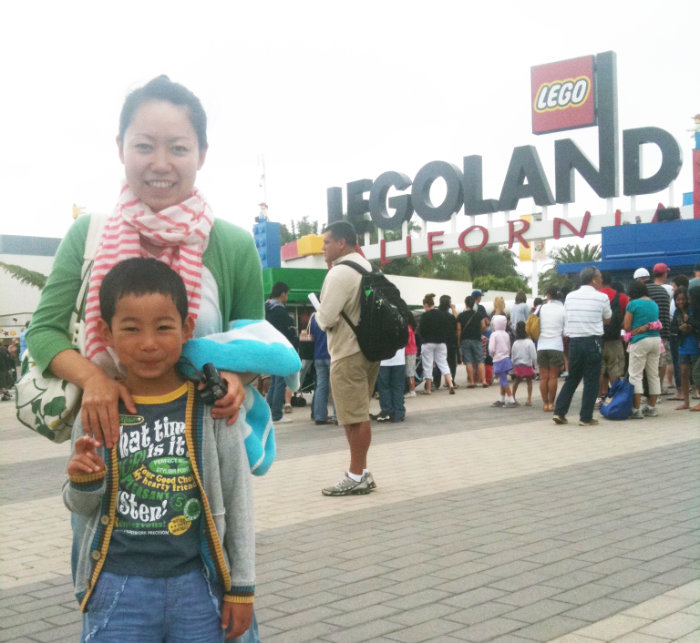 息子さんとカリフォルニアのテーマパークの前で。当時小学1年生だった息子さんも今や大学生に。