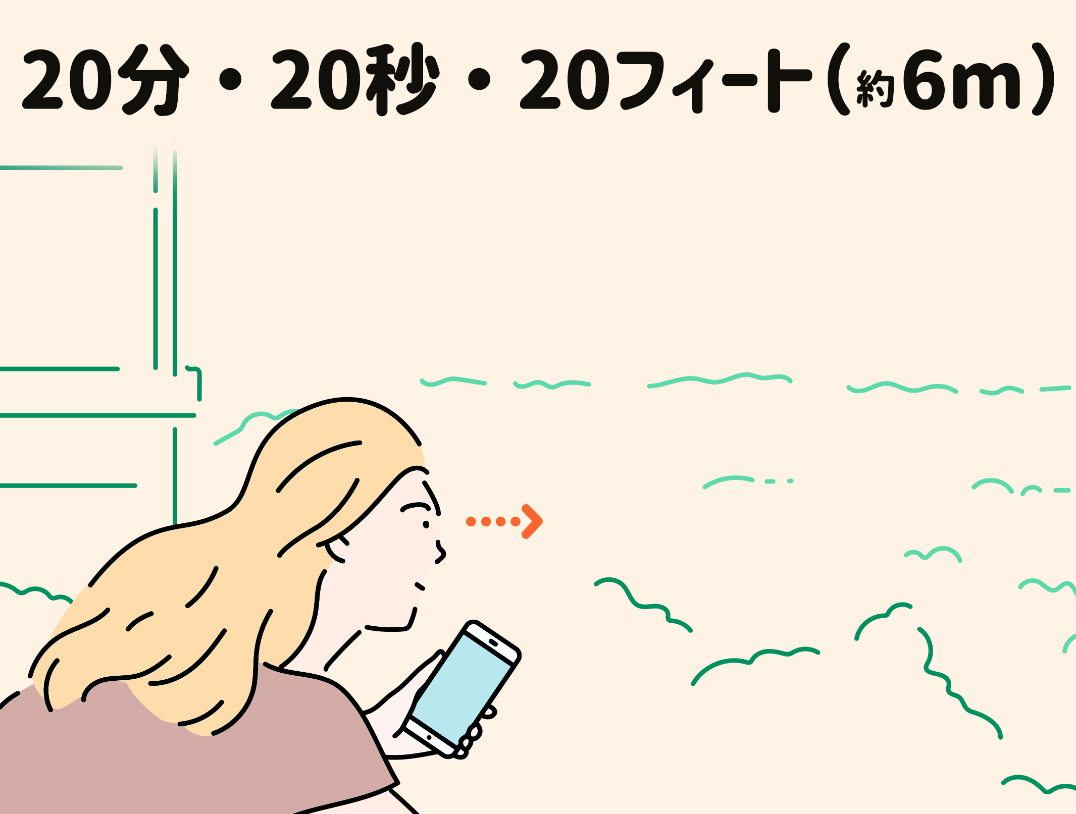 米国眼科学会は、デジタルデバイス使用時に20分に1回・最低20秒間・20フィート(約6メートル)以上先を見て目を休める「20-20-20ルール」1を提唱しています。