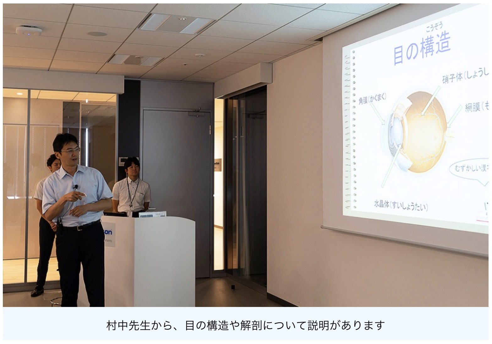 まず、ときわ台村中眼科の村中先生から、五感の中でも視覚は人間が得る全情報量の80%を収集している重要な器官であるため、生活する上で見えることはとても大切であること、そして、目から入った情報が脳で認識されることで初めて見えるということを学びます。