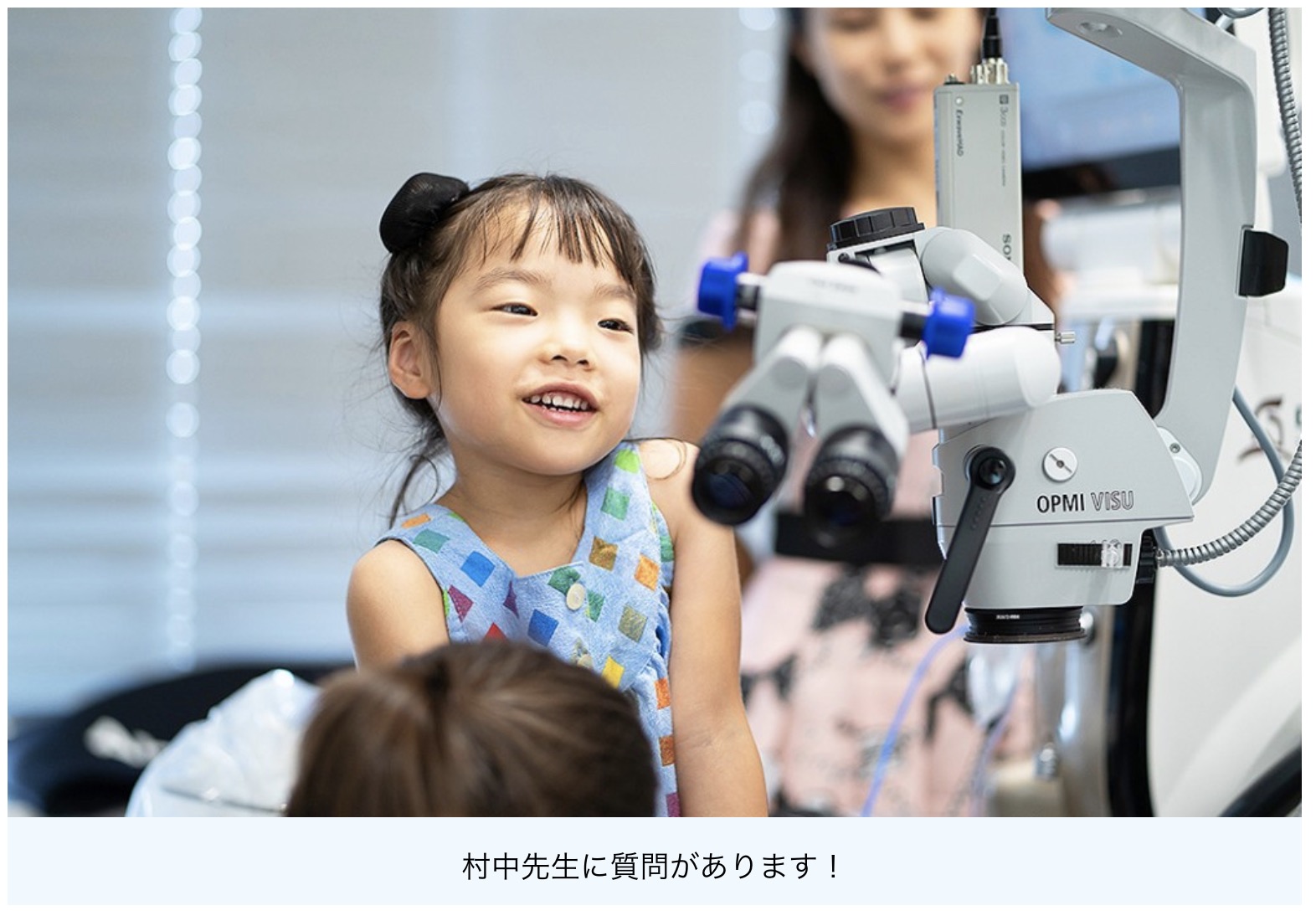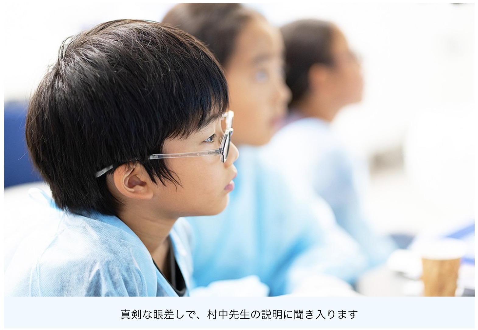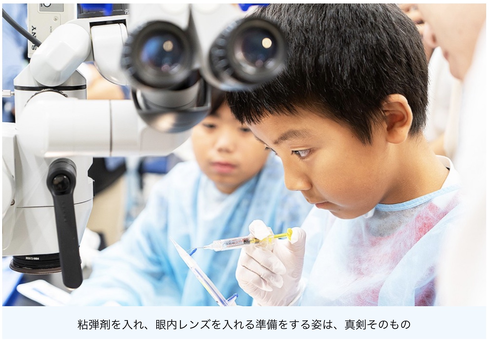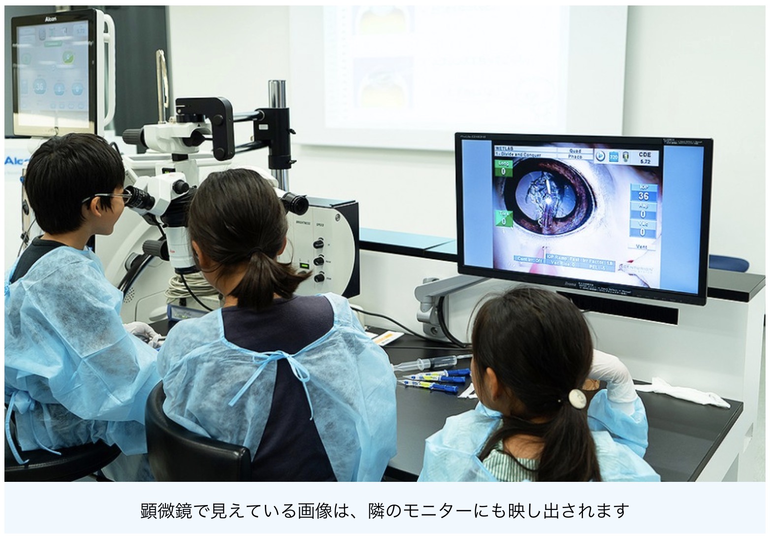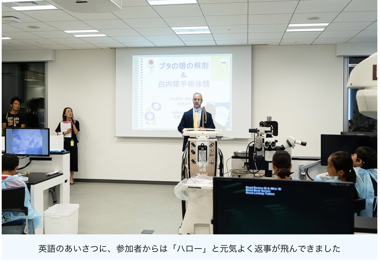 「皆さんが今、座っている椅子に、眼科医の先生たちも実際に座って白内障の手術の練習をしています。今日は皆さんが眼科医になって目の勉強をしてください。」とコズロスキー本部長が話すと、「そうだよ、これからお医者さんになるんだよ!」と声があがります。手術着を着た小さな眼科医たちは、白内障手術体験を待ちきれません。