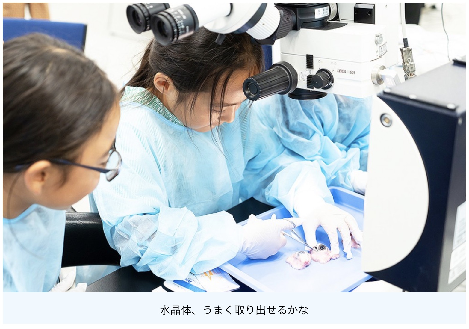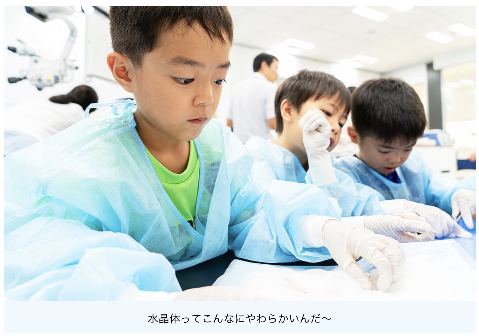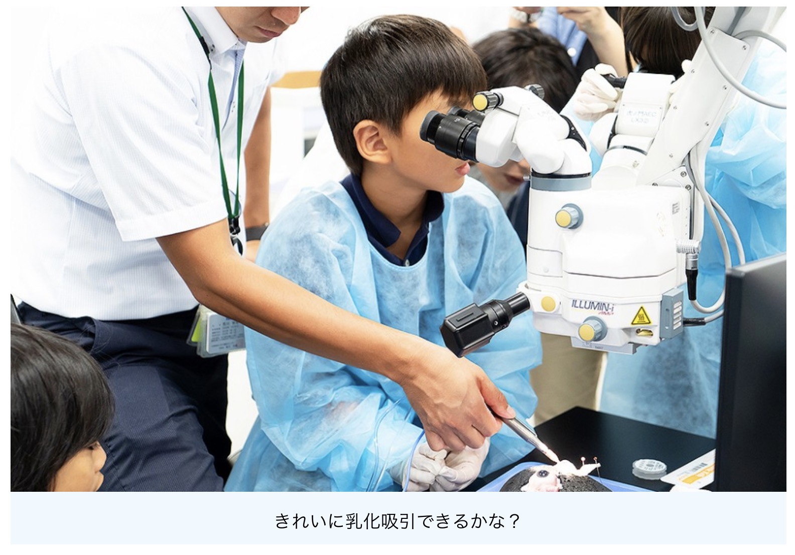 医療現場で実際に使用されている手術機器を使って、白内障の手術体験に取り組む子どもたちの生き生きとした姿を、当日のプログラムの流れに沿ってご紹介します。