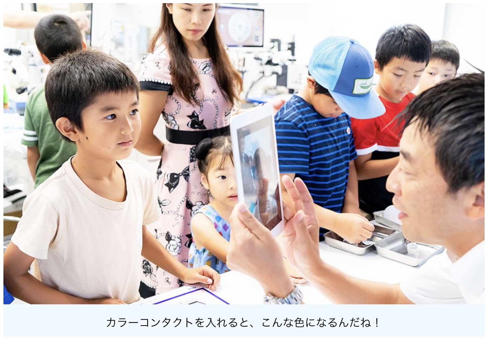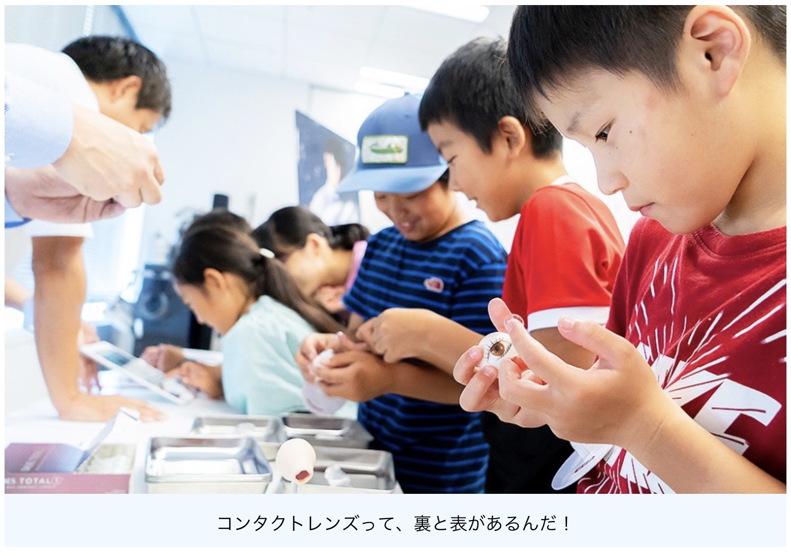 コンタクトレンズを初めて触る子どもたち。素材による触り心地の違いや、裏表の違いを学びます。カラーコンタクトを装用すると自分がどのように見えるかを体験できるアプリにワクワク。
