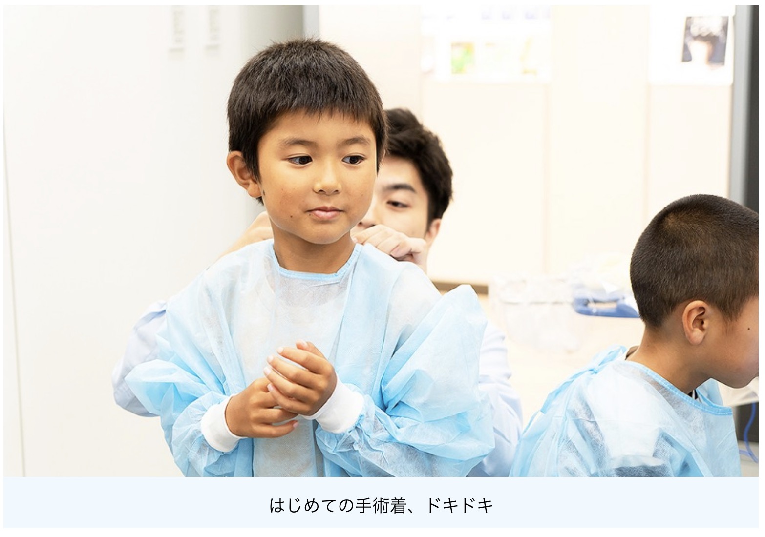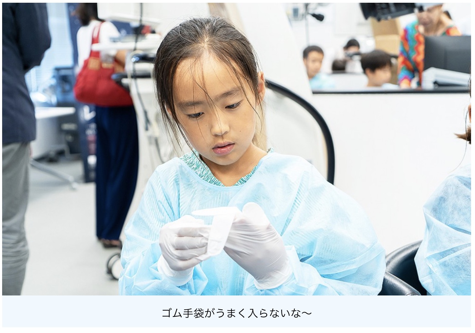 「原っぱ大学」の塚越学長からプログラムと注意事項の説明を受けた後、子どもたちは、アルコン社員に手伝ってもらいながら、手術着とゴム手袋、靴カバーを身に着けていきます。