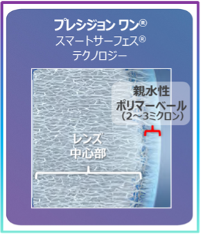 ・保水性の高い成分を含む「親水性ポリマー」でレンズ表面を覆うことで、レンズ表面の含水率を80%以上まで高めることに成功※6。この親水性ポリマーベールにより、長く続くうるおいや、涙液層の安定化のサポート、レンズ表面の滑らかさを実現し、16時間続く快適性※1と、鮮明な見え方※4を提供しています。