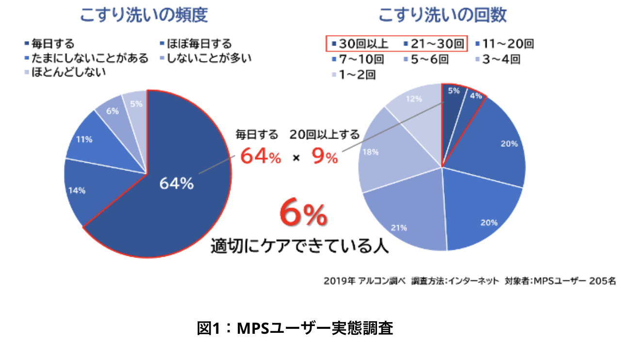 2019年にアルコンが行った、「消毒・洗浄・すすぎ・保存」を1本で行えるMPS(マルチパーパスソリューション)タイプのユーザーを対象にした調査によると、毎日20回以上のこすり洗いができているユーザーは6%のみで(図1)、ほとんどの人が不適切なケアを行っていることが分かりました。こうしたコンタクトレンズの不適切なケアは、細菌・真菌・アカントアメーバなどを繁殖させることにつながり、角膜感染症を引き起こす恐れがあります8。
