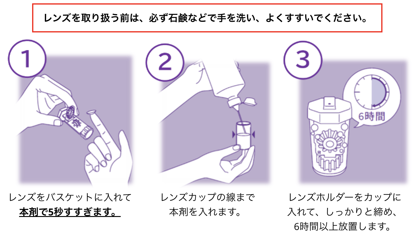 - 消毒終了後、カップをクリアケア® プラス ハイドラグライド®、もしくはクリアケア® リンス&ゴー®などソフトコンタクトレンズ用保存液ですすぎ、自然乾燥させてください。