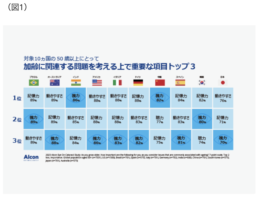 「視力」は、加齢に関連する問題を考える上で重要な項目として、対象10か国すべての国でトップ3項目にランクイン。10市場平均では、2番目に重要視される結果に