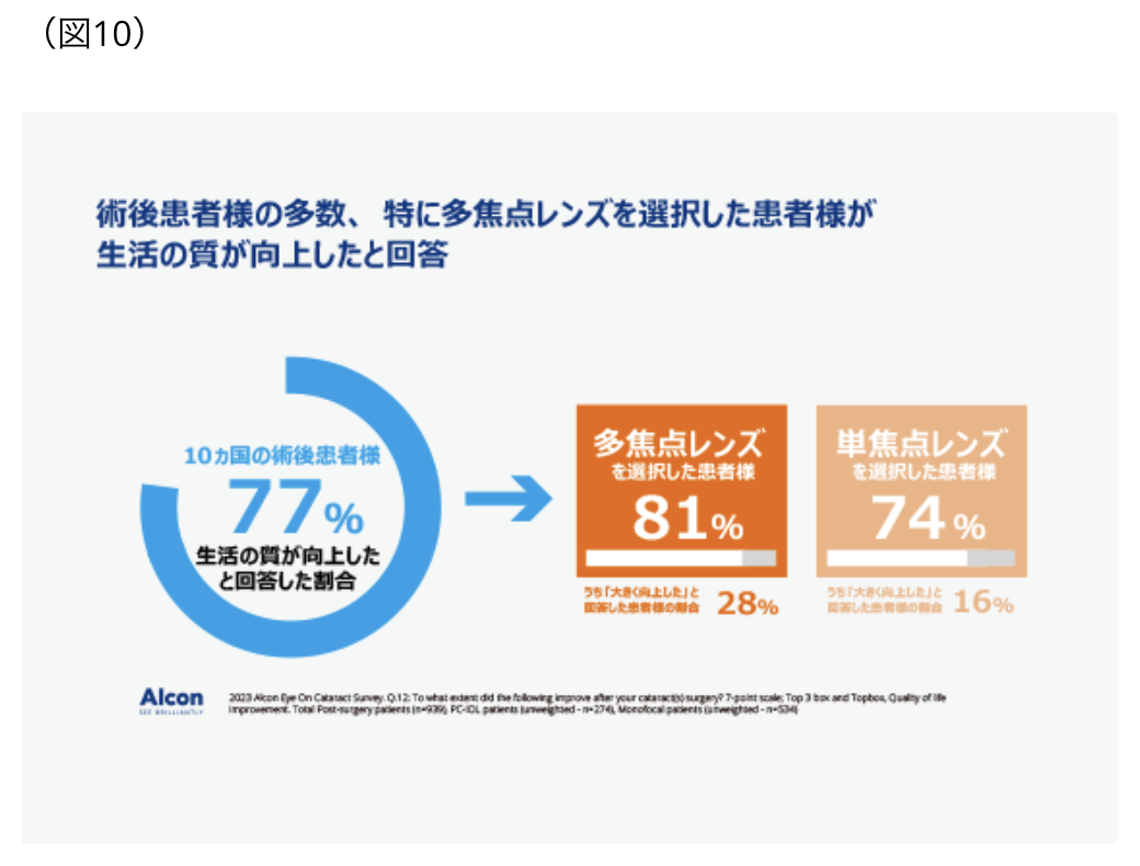 白内障手術後の患者様の多くが、手術後の生活の質(日本の患者様の72%、調査対象10か国総合の77%)および視力(日本の患者様、調査対象10か国総合のそれぞれ87%)が向上したと回答(図9)しました。また、10か国総合のデータでは、多焦点眼内レンズを選択した患者様において手術後の生活の質が向上したと回答する割合(81%)が、単焦点眼内レンズを選択した患者様(74%)と比較し、高くなりました(図10)。