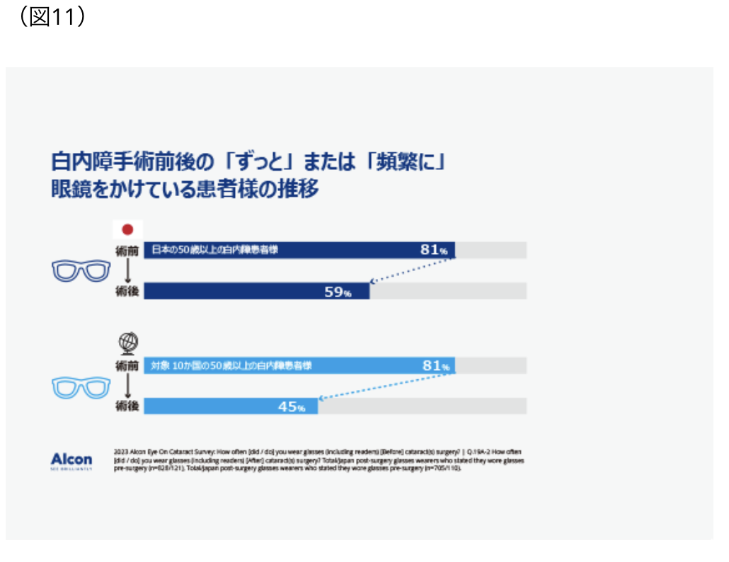 白内障手術後の患者様に、白内障手術前後でどのような頻度で眼鏡をかけている(いた)か尋ねたところ、「ずっと」または「頻繁に」眼鏡をかけていると回答する患者様は、日本では術前が81%に対し術後が59%、対象10か国では術前が81%に対し、術後が45%と、白内障手術前後で大幅に減少する結果となりました(図11)。