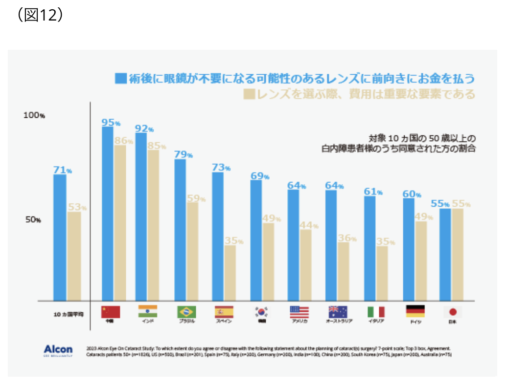対象10か国のほとんどで、「術後に眼鏡が不要になる可能性のある眼内レンズに前向きにお金を払う」と回答する患者様が、「レンズを選ぶ際、費用は重要な要素である」と回答する患者様の割合を超える結果に