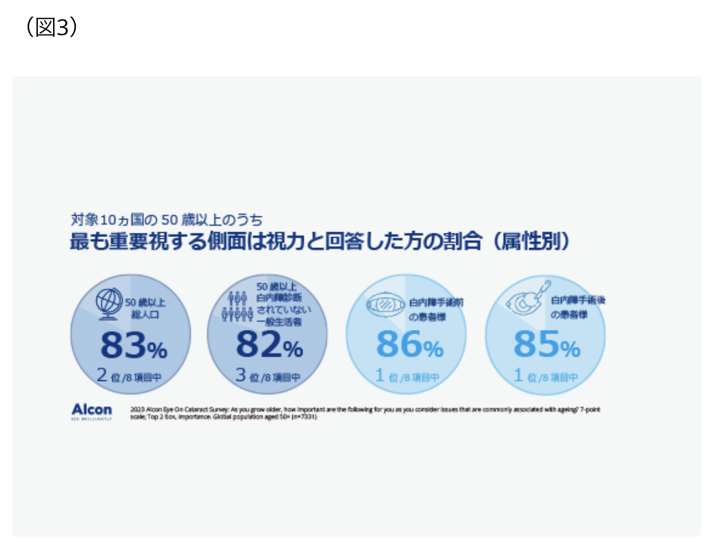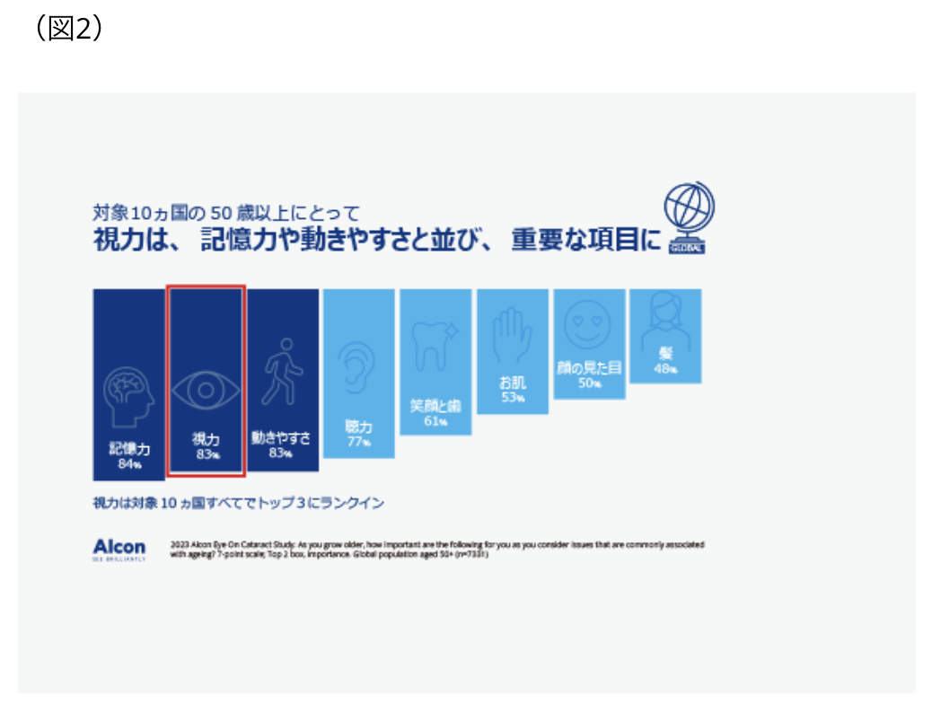 - 国内外の50歳以上の生活者に視力が重要視され、白内障手術への投資意欲も高い一方で、日本人の白内障治療に関する理解度は、調査対象10か国の平均と比較し低い傾向に