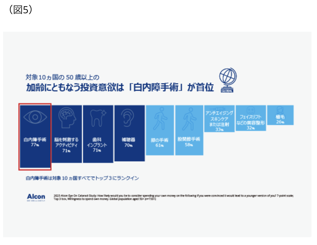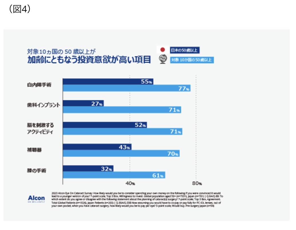 「アンチエイジングのためのスキンケアや注射」、「脳を刺激する活動」、「白内障手術」など、若返りにつながると確信できるなら、お金を使うことを考える可能性がどの程度あるか尋ねたところ、日本においても、10か国総合においても「白内障手術」が首位となり(図4および5)、対象の国のすべてで3位以内にランクインしました。50代以上の多くが、白内障を身近な問題として捉えていることが明るみになる結果となりました。