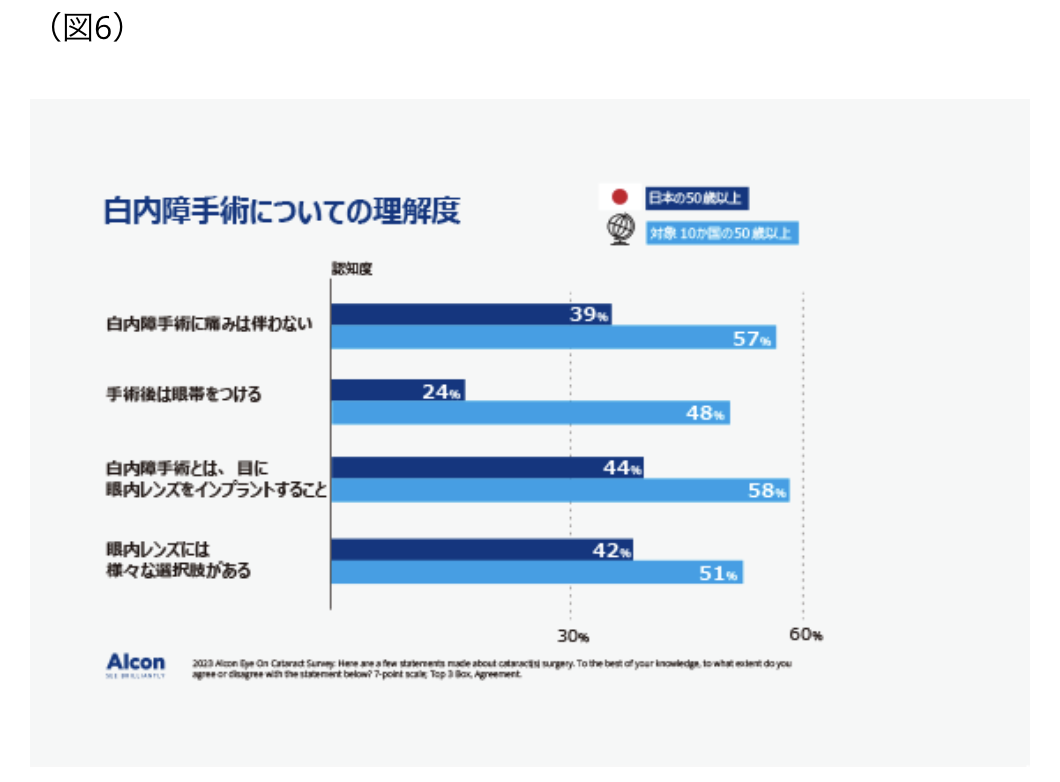 白内障の有病率や調査対象者が視力の重要性を高く評価する調査結果にもかかわらず、白内障治療用の眼内レンズ(IOL)をインプラントする白内障手術を認知しているのは、50歳以上の日本人のわずか44%でした。さらに、患者様それぞれのニーズに即して、多焦点レンズや乱視用など数種類の眼内レンズから、インプラントする眼内レンズを選ぶことができることを知っている50歳以上の日本人の割合も半数以下(42%)となり、10か国平均と比較しても低い結果にとどまりました(図6)。