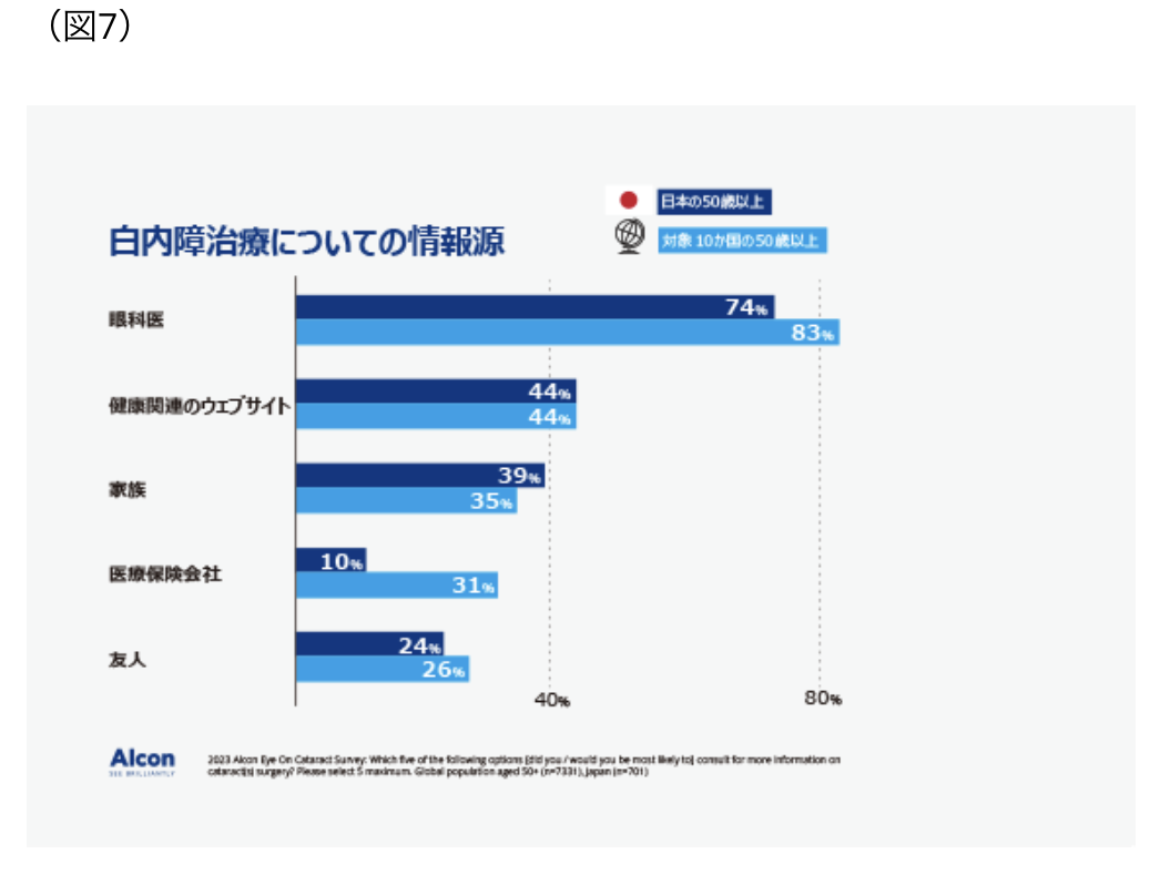 なお、白内障治療についての情報源として選ばれたのは、日本においても対象10か国総合においても「眼科医」が圧倒的首位となりました(図7)。この結果から、多くの人が、白内障罹患の際には、信頼のおける眼科医から白内障手術についての知識を得たいと考えていることがわかります。