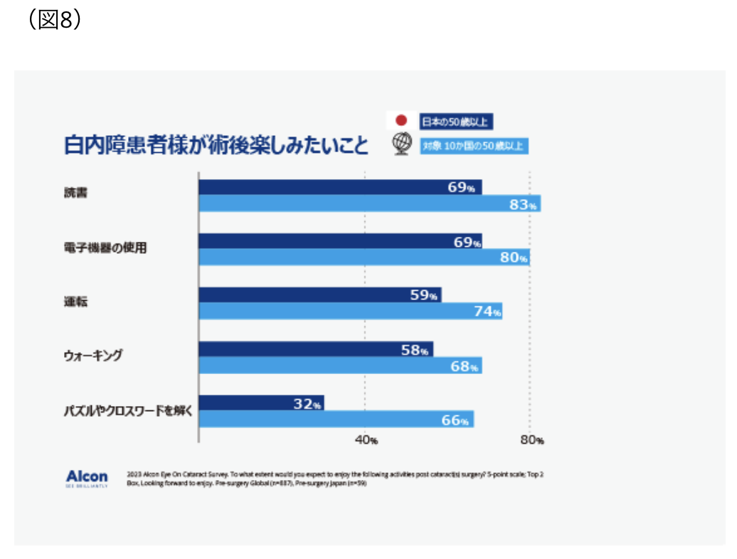 白内障治療の手術前の患者様に、白内障手術後に楽しみたいことを尋ねたところ、10か国総合では、1位「読書」、2位「電子機器の使用」、3位「運転」が上位に、国内でも、同様に「読書」と「電子機器の使用」が並んで同率1位に、「運転」が3位(図8)という結果となりました。