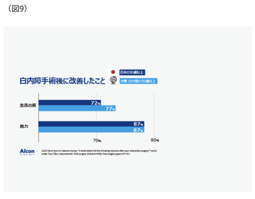 - 調査対象10か国で、71%の患者様が白内障手術後生活の質が向上したと回答。多焦点眼内レンズを選択した患者様においては81%とより高い傾向に
