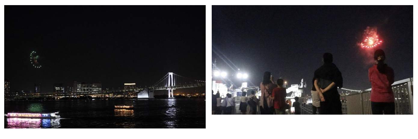 10月10日(月・祝)19時00分、レインボーブリッジを背景に、色鮮やかな花火が東京の夜空を彩りました。目の愛護デーにちなみ、目の形をした特注花火や、視力検査に用いられるランドルト環(Cマーク)の花火、また、「20-20-20ルール」2を連想させる「20」の形をした花火が次々と打ち上げられました。その後20分の間隔を置き、19時20分、19時40分にも、デジタルデバイスから目を離すきっかけとして、各1分間ほど同様の花火が打ち上がりました。近隣の方々、道行く方々、仕事中の方々も、ふいに打ち上げられた花火に思わず夜空を見上げ、笑顔とともにひと時の“デジタルデトックス”を体験していました。
