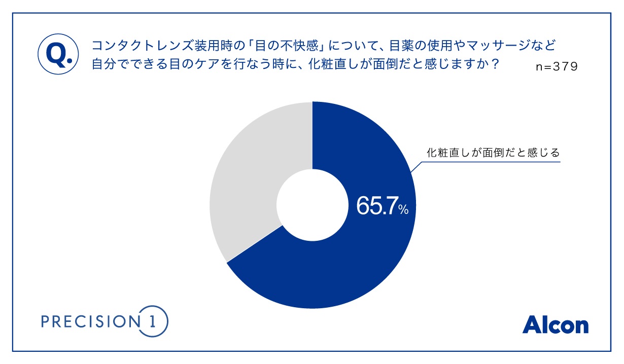 また65.7%の人が、目薬を差したり目のマッサージを行ったりといった目の不快感への対処をしたことにより化粧が崩れてしまい、「化粧直しが面倒だと感じる」と回答。不快感への対処が、新たな二次的ストレスを生み出していることも判明しました。