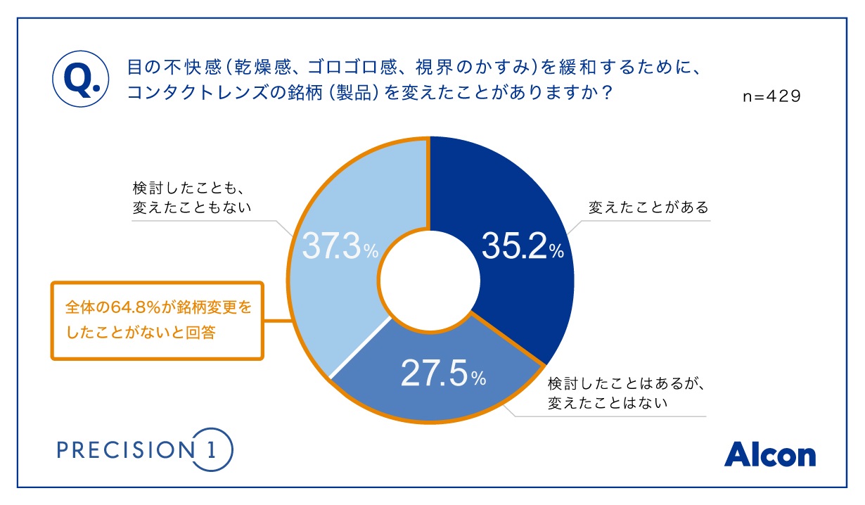 - 一方で、コンタクト装用時の不快感の根本的な解消または緩和になりうる「別の銘柄のコンタクトレンズに変更したことがある」は35.2%にとどまる結果に