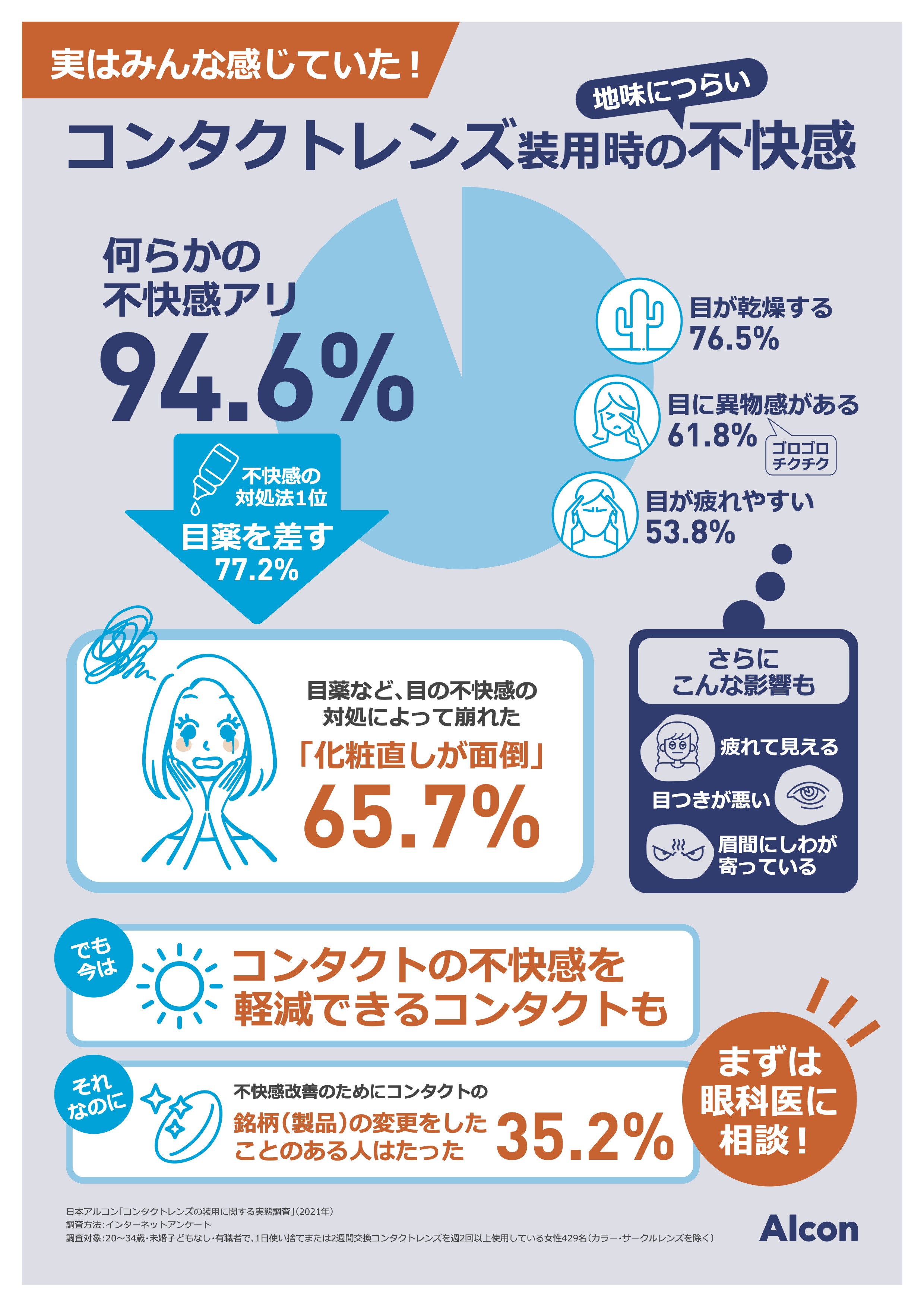 日本アルコン、20~30代女性のコンタクト装用実態を調査 約95%が装用時の不快感を経験 「化粧崩れ」という新たな二次的ストレスも
